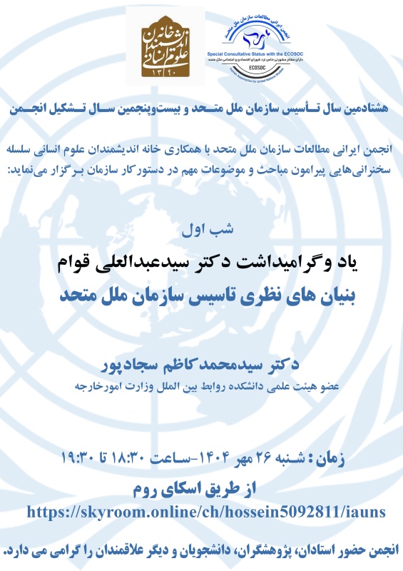 انجمن ایرانی مطالعات سازمان ملل متحد، به مناسبت هشتادمین سال تاسیس سازمان ملل متحد و بیست و پنجمین سال تشکیل انجمن، سلسله سخنرانیهای آموزشی پیرامون مباحث و موضوعات مهم در دستور کار سازمان را به صورت وبینار، با شرکت استادان و کارشناسان برجسته حقوق و روابط بینالملل و با همکاری خانه اندیشمندان علوم انسانی برگزار مینماید. این وبینارها از شامگاه روز شنبه، ۲۶ مهرماه، آغاز و تا شب، ۱۰ آبانماه، ادامه خواهد داشت. در هر یک از این وبینارها، یاد و نام اعضای گرانقدر درگذشته انجمن که در طی بیستوپنج سال حیات آن روی در نقاب خاک کشیدهاند، گرامی داشته میشود.