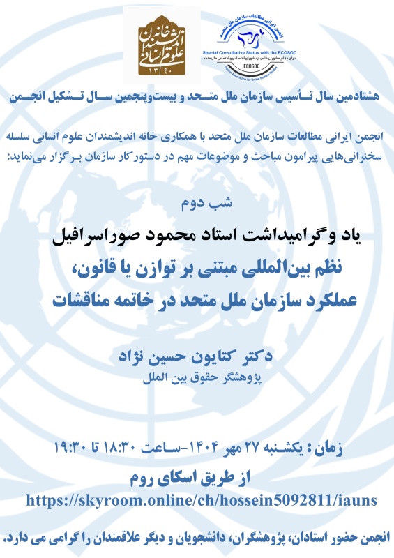 | استاد محمود صور اسرافیل | دکتر کتایون حسیننژاد پژوهشگر حقوق بین الملل | نظم بینالمللی مبتنی بر توازن یا قانون، عملکرد سازمان ملل متحد در خاتمه مناقشات | یکشنبه ۲۷ مهرماه |