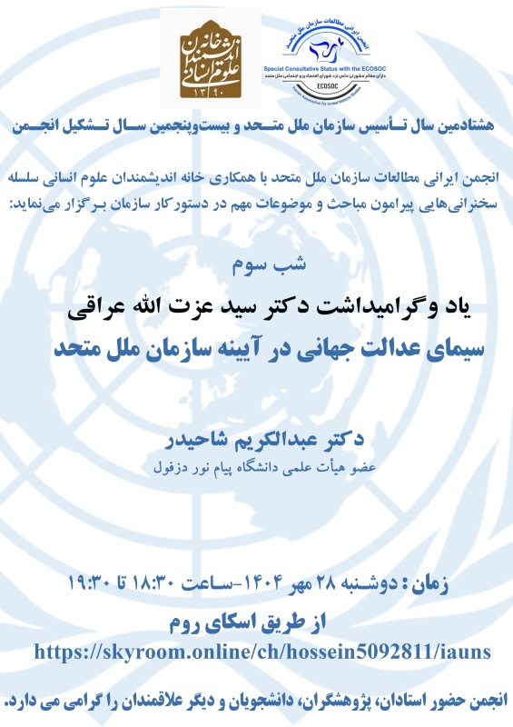 | دکتر سید عزتالله عراقی | دکتر عبدالکریم شاحیدر عضو هیأت علمی دانشگاه پیام نور دزفول | سیمای عدالت جهانی در آیینه سازمان ملل متحد | دوشنبه ۲۸ مهرماه |